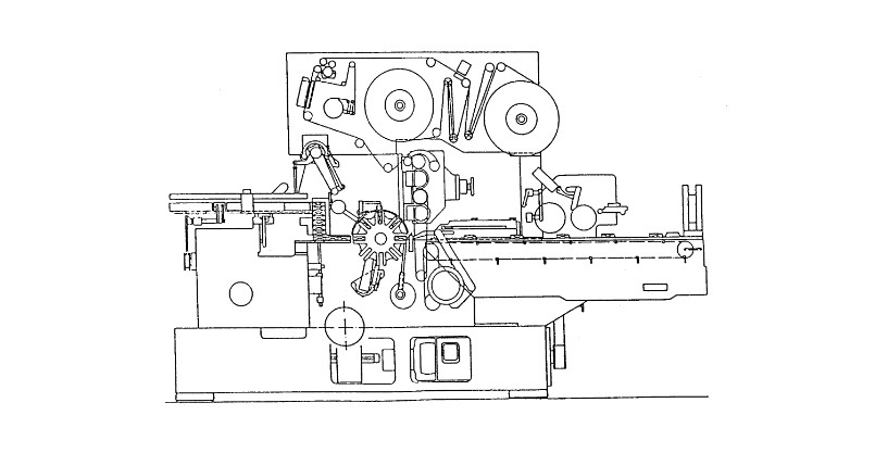 (二)機械傳動   401型小包薄膜包裝機由立勵磁的直流分路繞線式電機提供驅動力。主電機 (2)通過定時皮帶 (3)帶動主傳動軸 (1),主傳動軸 (1)將動力分配成5路。     主傳動軸上的齒輪系 (10)傳動軸 (15),軸 (15)通過傘齒輪體 (12)帶動定時皮帶 (11)。定時皮帶 (11)驅動分離輪 (13)和傳送輪 (14)2路 ,主傳動軸上的錐齒輪副 (8)帶動偏心圓盤 (16)和連桿 (17),拖動行走架 (18)和輸人推送器 (19)作往復直線運動。